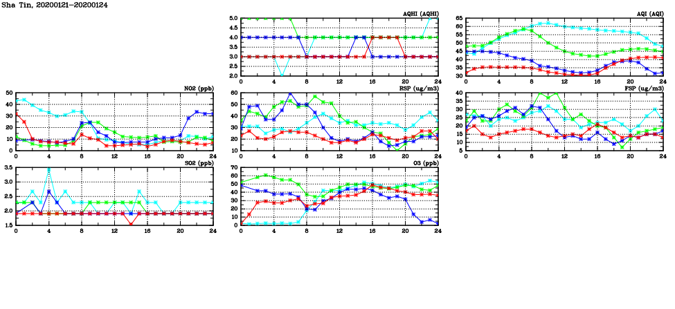 | Air Quality Data Time Series in Sha Tin (2020/01/24) | ( Line colors: Day -3 Day -2 Day -1 Current day ) | 2D Map Current AQHI |