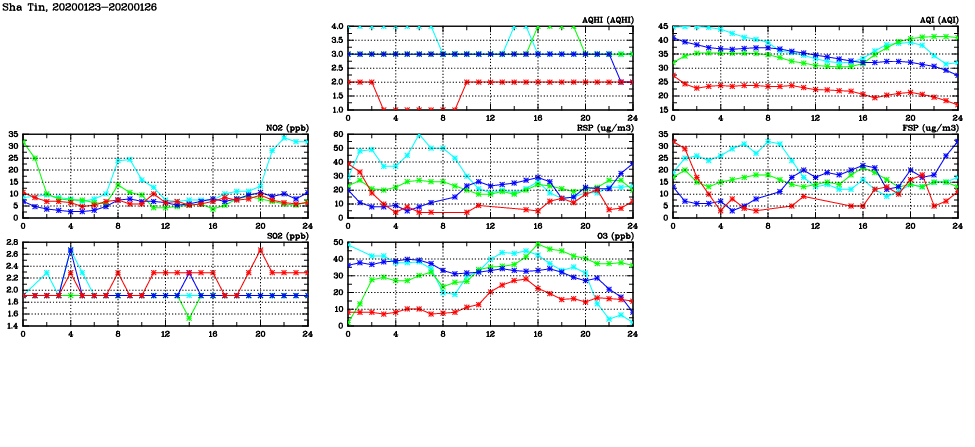 | Air Quality Data Time Series in Sha Tin (2020/01/26) | ( Line colors: Day -3 Day -2 Day -1 Current day ) | 2D Map Current AQHI |