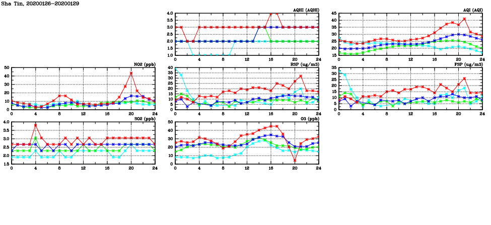 | Air Quality Data Time Series in Sha Tin (2020/01/29) | ( Line colors: Day -3 Day -2 Day -1 Current day ) | 2D Map Current AQHI |