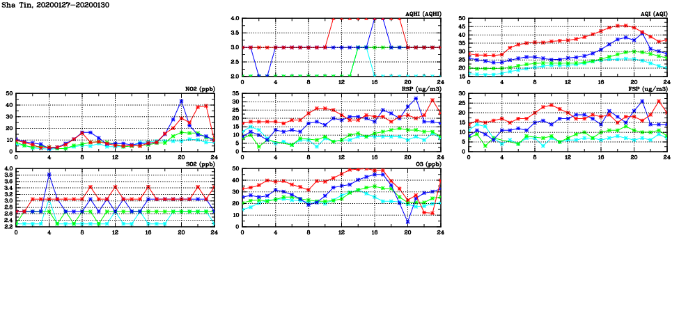 | Air Quality Data Time Series in Sha Tin (2020/01/30) | ( Line colors: Day -3 Day -2 Day -1 Current day ) | 2D Map Current AQHI |