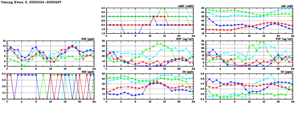 | Air Quality Data Time Series in Tseung Kwan O (2020/01/27) | ( Line colors: Day -3 Day -2 Day -1 Current day ) | 2D Map Current AQHI |