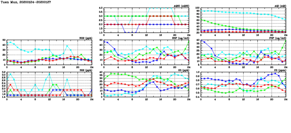 | Air Quality Data Time Series in Tuen Mun (2020/01/27) | ( Line colors: Day -3 Day -2 Day -1 Current day ) | 2D Map Current AQHI |