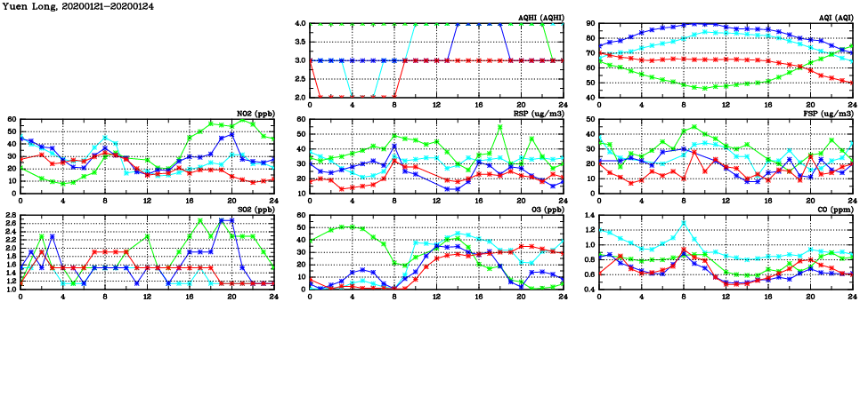 | Air Quality Data Time Series in Yuen Long (2020/01/24) | ( Line colors: Day -3 Day -2 Day -1 Current day ) | 2D Map Current AQHI |