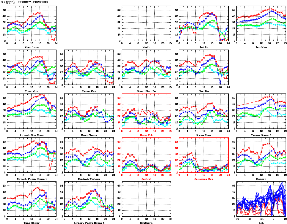| Air Quality Data Time Series for O3 (2020/01/30) | ( Line colors: Day -3 Day -2 Day -1 Current day ) | 2D Map Current AQHI |