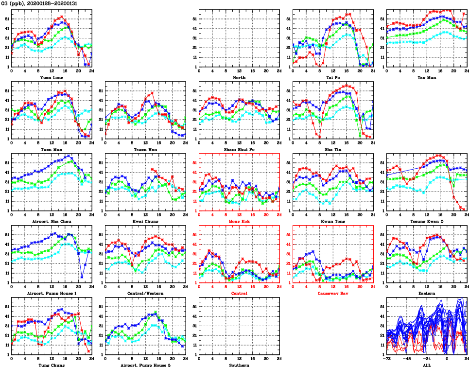 | Air Quality Data Time Series for O3 (2020/01/31) | ( Line colors: Day -3 Day -2 Day -1 Current day ) | 2D Map Current AQHI |