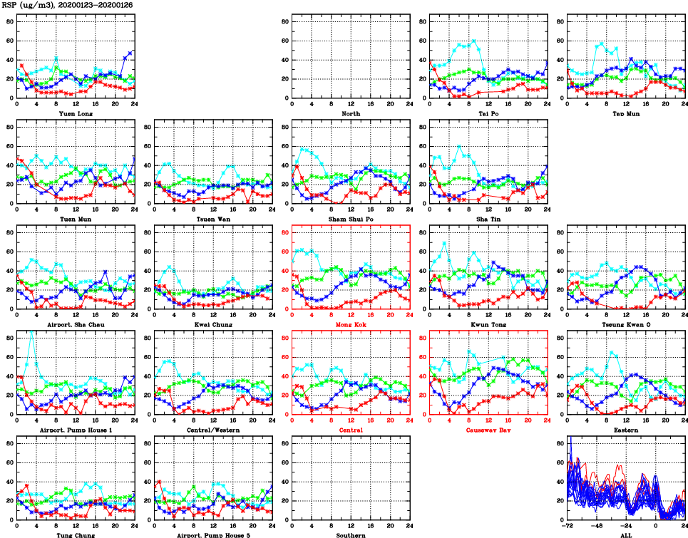 | Air Quality Data Time Series for RSP (2020/01/26) | ( Line colors: Day -3 Day -2 Day -1 Current day ) | 2D Map Current AQHI |