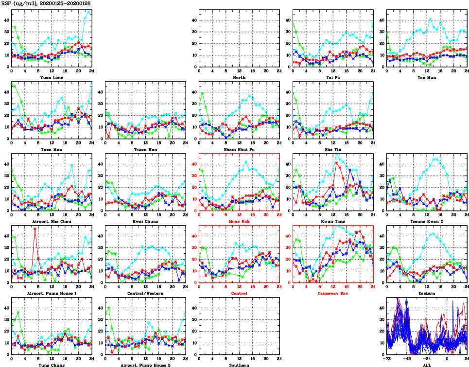 | Air Quality Data Time Series for RSP (2020/01/28) | ( Line colors: Day -3 Day -2 Day -1 Current day ) | 2D Map Current AQHI |