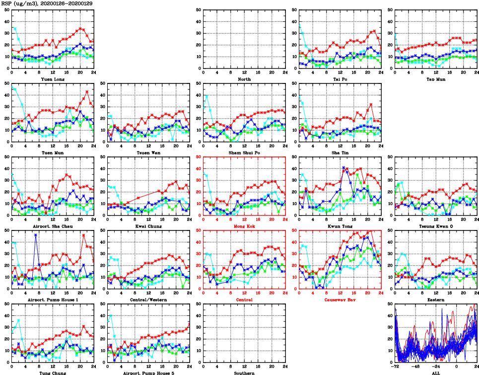 | Air Quality Data Time Series for RSP (2020/01/29) | ( Line colors: Day -3 Day -2 Day -1 Current day ) | 2D Map Current AQHI |