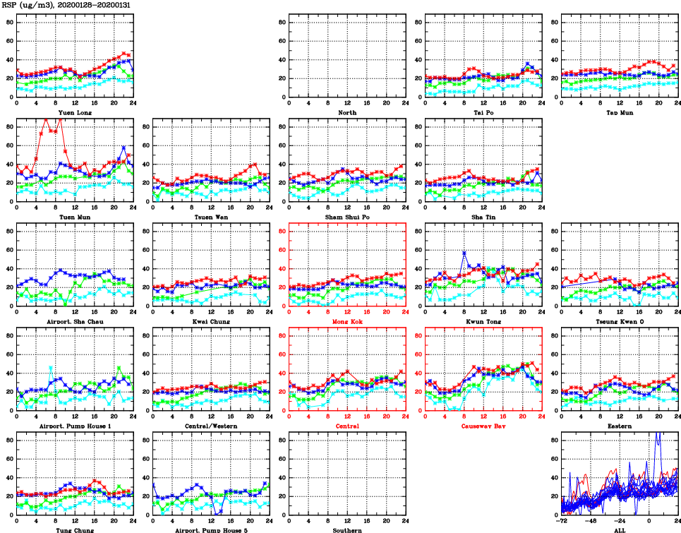 | Air Quality Data Time Series for RSP (2020/01/31) | ( Line colors: Day -3 Day -2 Day -1 Current day ) | 2D Map Current AQHI |