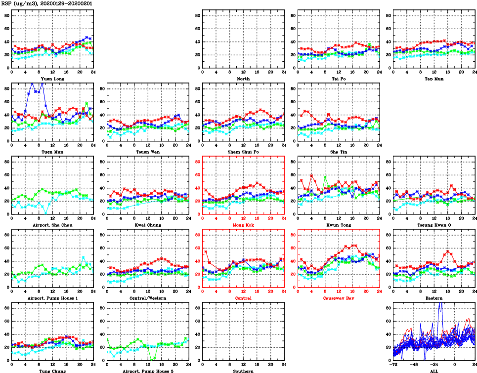 | Air Quality Data Time Series for RSP (2020/02/01) | ( Line colors: Day -3 Day -2 Day -1 Current day ) | 2D Map Current AQHI |