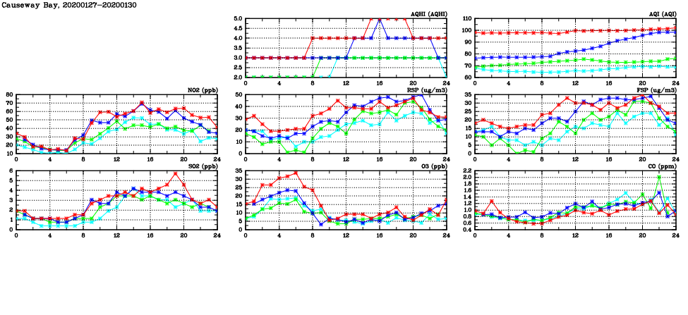 | Air Quality Data Time Series in Causeway Bay (2020/01/30) | ( Line colors: Day -3 Day -2 Day -1 Current day ) | 2D Map Current AQHI |