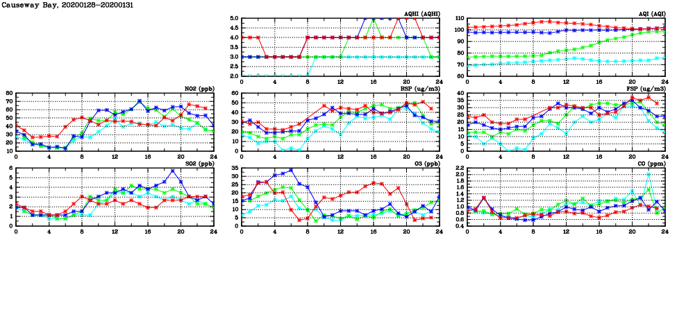 | Air Quality Data Time Series in Causeway Bay (2020/01/31) | ( Line colors: Day -3 Day -2 Day -1 Current day ) | 2D Map Current AQHI |
