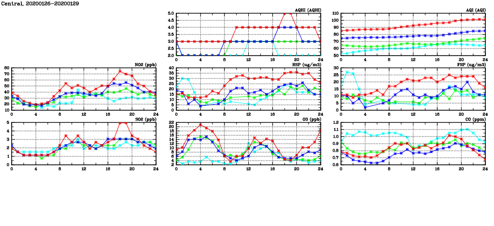 | Air Quality Data Time Series in Central (2020/01/29) | ( Line colors: Day -3 Day -2 Day -1 Current day ) | 2D Map Current AQHI |