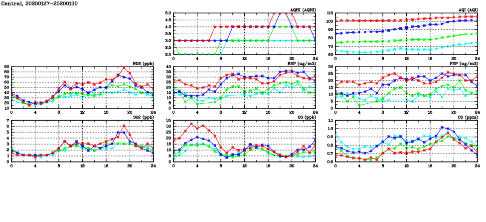 | Air Quality Data Time Series in Central (2020/01/30) | ( Line colors: Day -3 Day -2 Day -1 Current day ) | 2D Map Current AQHI |