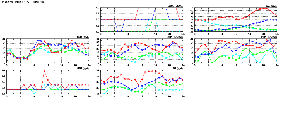 | Air Quality Data Time Series in Eastern (2020/01/30) | ( Line colors: Day -3 Day -2 Day -1 Current day ) | 2D Map Current AQHI |