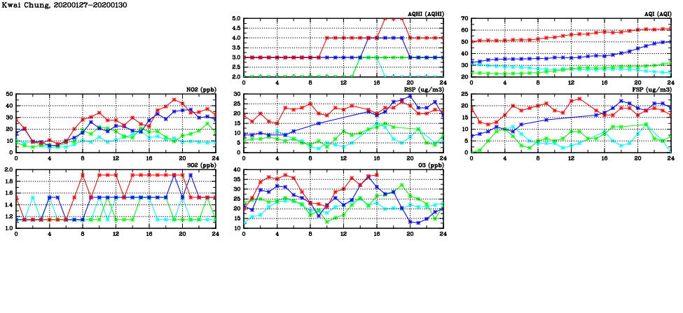 | Air Quality Data Time Series in Kwai Chung (2020/01/30) | ( Line colors: Day -3 Day -2 Day -1 Current day ) | 2D Map Current AQHI |