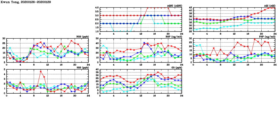 | Air Quality Data Time Series in Kwun Tong (2020/01/29) | ( Line colors: Day -3 Day -2 Day -1 Current day ) | 2D Map Current AQHI |