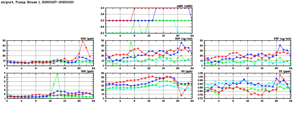 | Air Quality Data Time Series in Airport, Pump House 1 (2020/01/30) | ( Line colors: Day -3 Day -2 Day -1 Current day ) | 2D Map Current AQHI |