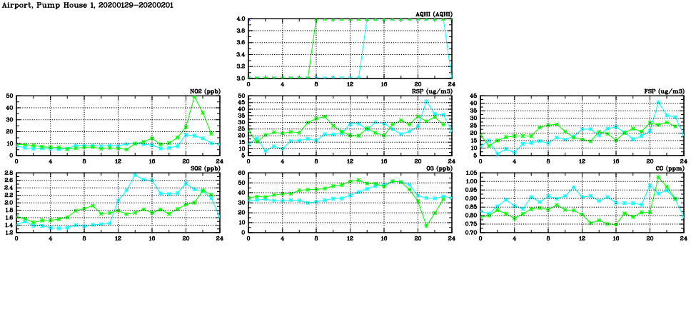 | Air Quality Data Time Series in Airport, Pump House 1 (2020/02/01) | ( Line colors: Day -3 Day -2 Day -1 Current day ) | 2D Map Current AQHI |