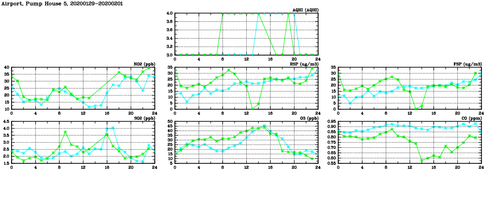 | Air Quality Data Time Series in Airport, Pump House 5 (2020/02/01) | ( Line colors: Day -3 Day -2 Day -1 Current day ) | 2D Map Current AQHI |