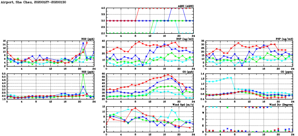 | Air Quality Data Time Series in Airport, Sha Chau (2020/01/30) | ( Line colors: Day -3 Day -2 Day -1 Current day ) | 2D Map Current AQHI |