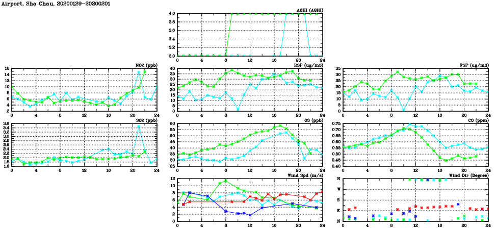 | Air Quality Data Time Series in Airport, Sha Chau (2020/02/01) | ( Line colors: Day -3 Day -2 Day -1 Current day ) | 2D Map Current AQHI |