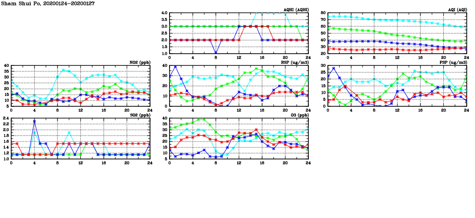 | Air Quality Data Time Series in Sham Shui Po (2020/01/27) | ( Line colors: Day -3 Day -2 Day -1 Current day ) | 2D Map Current AQHI |
