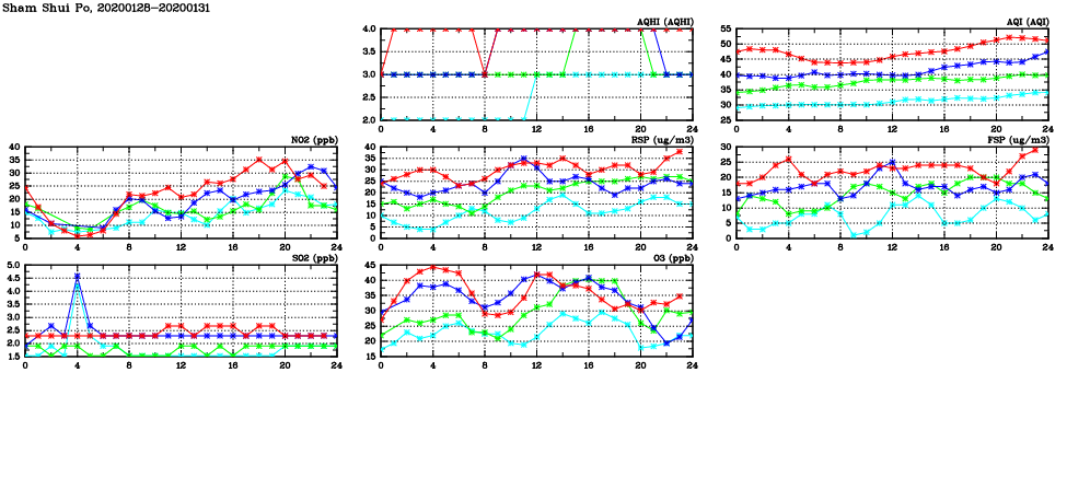 | Air Quality Data Time Series in Sham Shui Po (2020/01/31) | ( Line colors: Day -3 Day -2 Day -1 Current day ) | 2D Map Current AQHI |