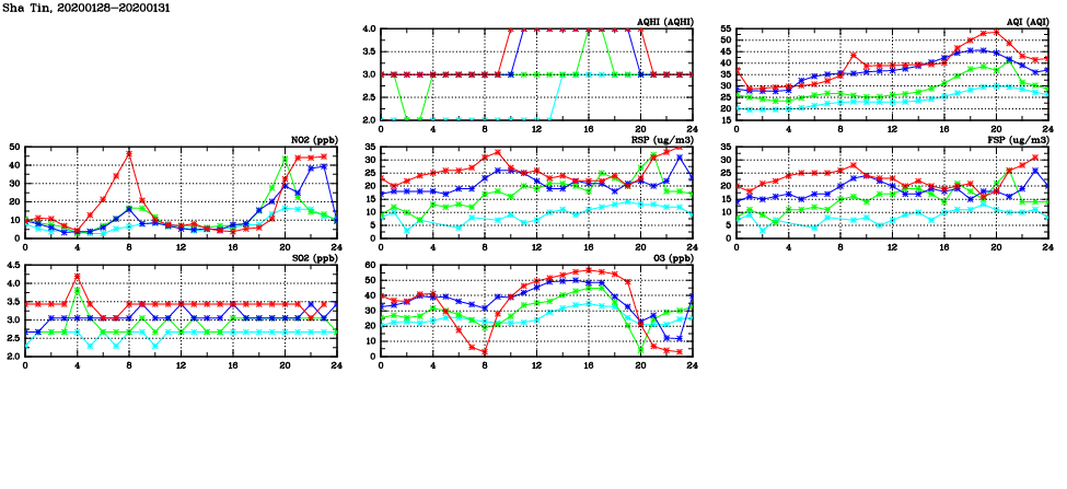 | Air Quality Data Time Series in Sha Tin (2020/01/31) | ( Line colors: Day -3 Day -2 Day -1 Current day ) | 2D Map Current AQHI |