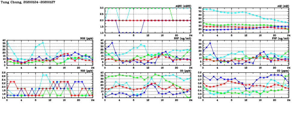 | Air Quality Data Time Series in Tung Chung (2020/01/27) | ( Line colors: Day -3 Day -2 Day -1 Current day ) | 2D Map Current AQHI |