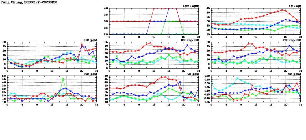 | Air Quality Data Time Series in Tung Chung (2020/01/30) | ( Line colors: Day -3 Day -2 Day -1 Current day ) | 2D Map Current AQHI |
