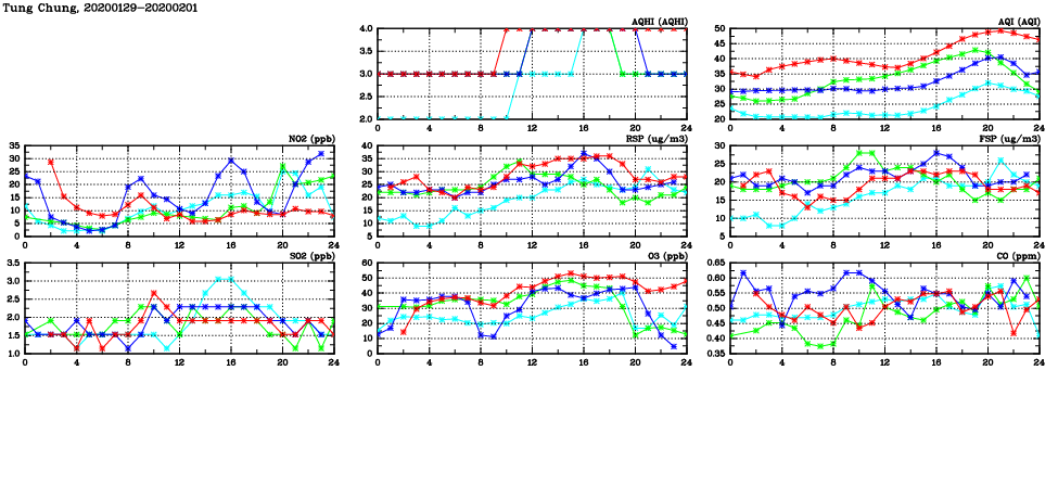 | Air Quality Data Time Series in Tung Chung (2020/02/01) | ( Line colors: Day -3 Day -2 Day -1 Current day ) | 2D Map Current AQHI |
