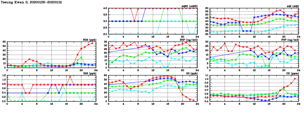 | Air Quality Data Time Series in Tseung Kwan O (2020/01/31) | ( Line colors: Day -3 Day -2 Day -1 Current day ) | 2D Map Current AQHI |