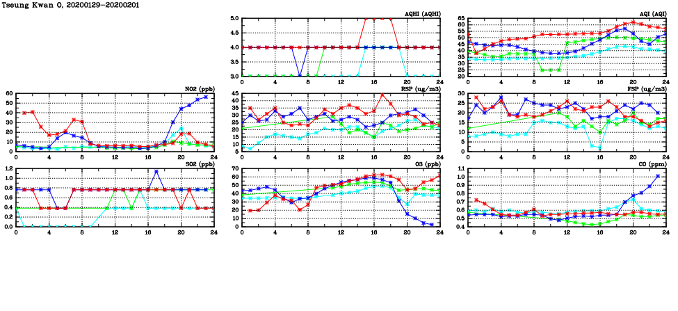 | Air Quality Data Time Series in Tseung Kwan O (2020/02/01) | ( Line colors: Day -3 Day -2 Day -1 Current day ) | 2D Map Current AQHI |
