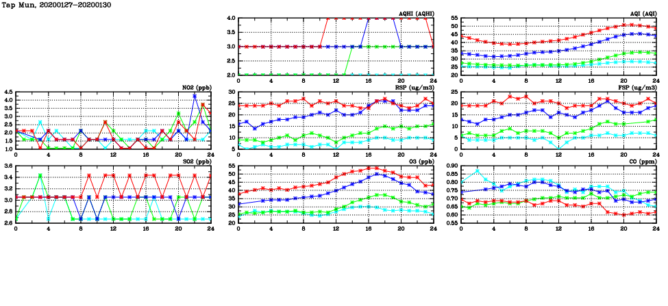| Air Quality Data Time Series in Tap Mun (2020/01/30) | ( Line colors: Day -3 Day -2 Day -1 Current day ) | 2D Map Current AQHI |