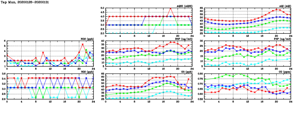 | Air Quality Data Time Series in Tap Mun (2020/01/31) | ( Line colors: Day -3 Day -2 Day -1 Current day ) | 2D Map Current AQHI |