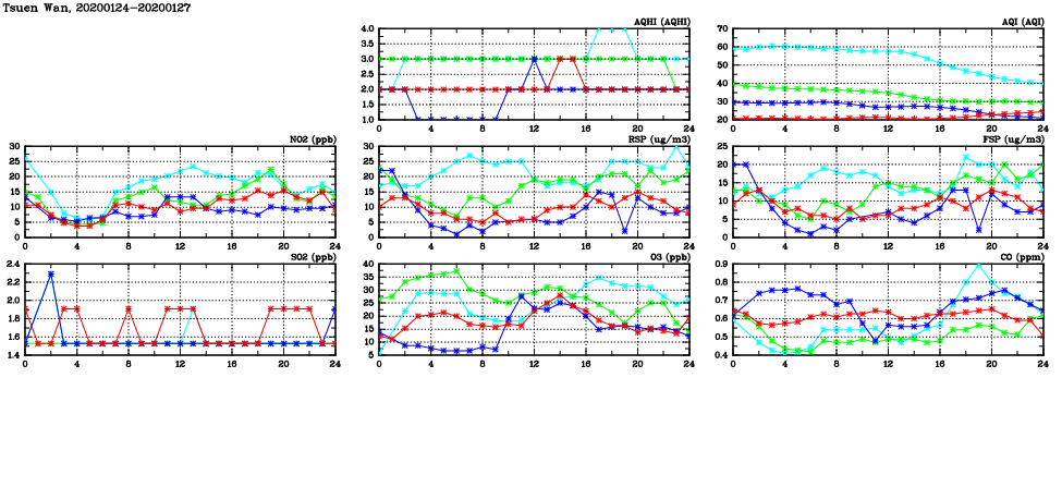 | Air Quality Data Time Series in Tsuen Wan (2020/01/27) | ( Line colors: Day -3 Day -2 Day -1 Current day ) | 2D Map Current AQHI |