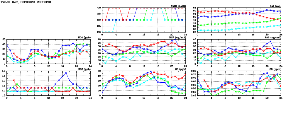 | Air Quality Data Time Series in Tsuen Wan (2020/02/01) | ( Line colors: Day -3 Day -2 Day -1 Current day ) | 2D Map Current AQHI |