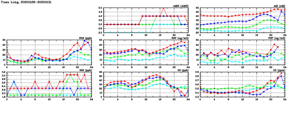 | Air Quality Data Time Series in Yuen Long (2020/01/31) | ( Line colors: Day -3 Day -2 Day -1 Current day ) | 2D Map Current AQHI |