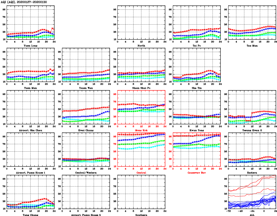 | Air Quality Data Time Series for AQI (2020/01/30) | ( Line colors: Day -3 Day -2 Day -1 Current day ) | 2D Map Current AQHI |