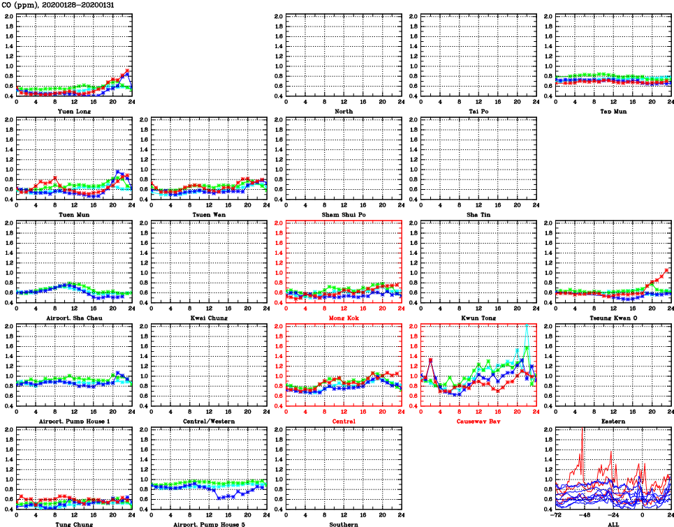 | Air Quality Data Time Series for CO (2020/01/31) | ( Line colors: Day -3 Day -2 Day -1 Current day ) | 2D Map Current AQHI |