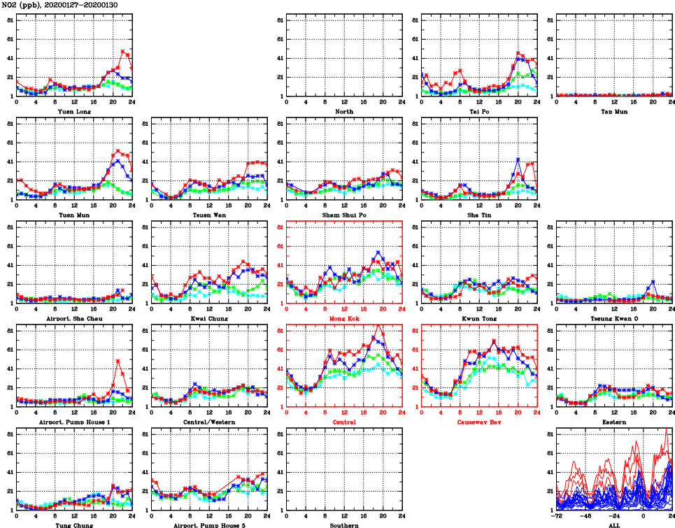 | Air Quality Data Time Series for NO2 (2020/01/30) | ( Line colors: Day -3 Day -2 Day -1 Current day ) | 2D Map Current AQHI |