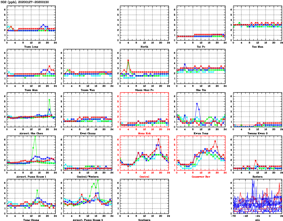 | Air Quality Data Time Series for SO2 (2020/01/30) | ( Line colors: Day -3 Day -2 Day -1 Current day ) | 2D Map Current AQHI |