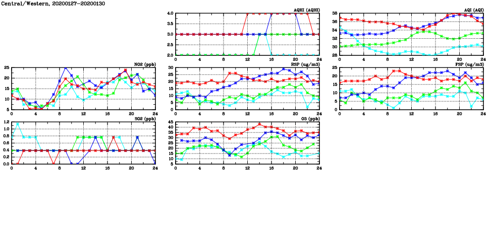 | Air Quality Data Time Series in Central/Western (2020/01/30) | ( Line colors: Day -3 Day -2 Day -1 Current day ) | 2D Map Current AQHI |