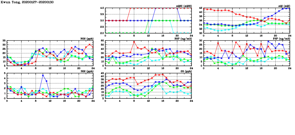 | Air Quality Data Time Series in Kwun Tong (2020/01/30) | ( Line colors: Day -3 Day -2 Day -1 Current day ) | 2D Map Current AQHI |