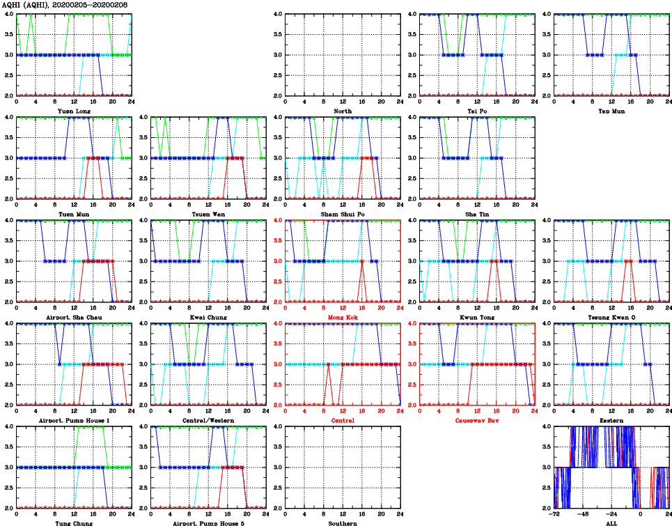 | Air Quality Data Time Series for AQHI (2020/02/08) | ( Line colors: Day -3 Day -2 Day -1 Current day ) | 2D Map Current AQHI |