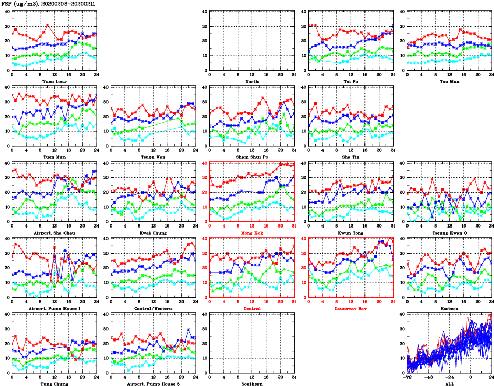 | Air Quality Data Time Series for FSP (2020/02/11) | ( Line colors: Day -3 Day -2 Day -1 Current day ) | 2D Map Current AQHI |