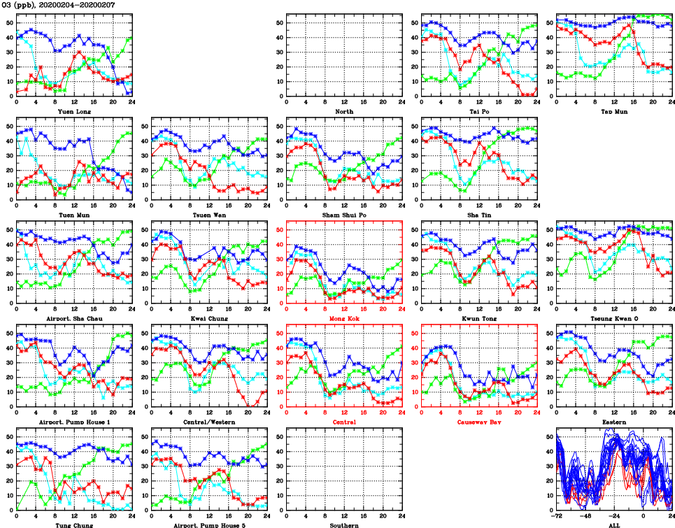 | Air Quality Data Time Series for O3 (2020/02/07) | ( Line colors: Day -3 Day -2 Day -1 Current day ) | 2D Map Current AQHI |
