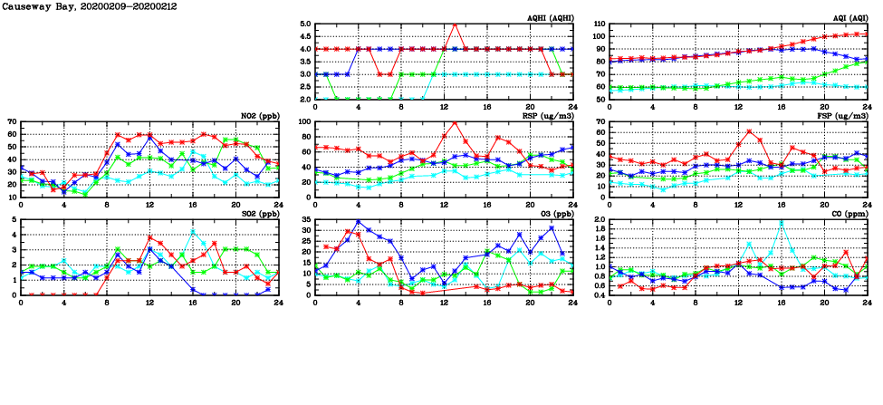 | Air Quality Data Time Series in Causeway Bay (2020/02/12) | ( Line colors: Day -3 Day -2 Day -1 Current day ) | 2D Map Current AQHI |