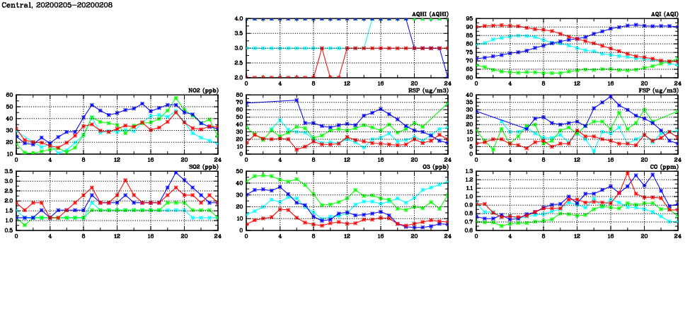 | Air Quality Data Time Series in Central (2020/02/08) | ( Line colors: Day -3 Day -2 Day -1 Current day ) | 2D Map Current AQHI |